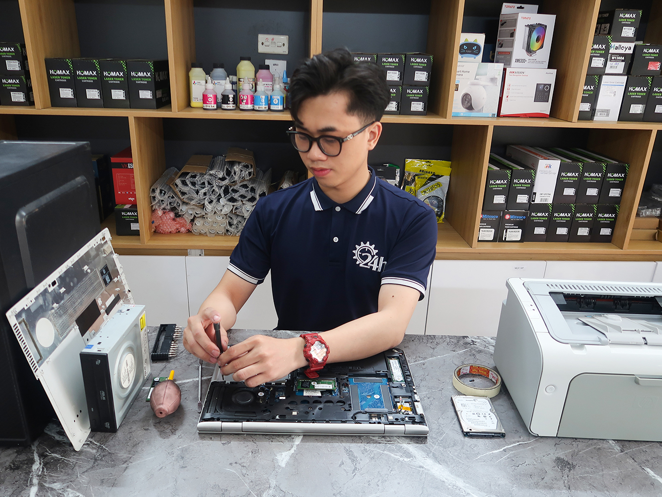 Sau hơn 15 năm phát triển dịch vụ sửa chữa máy văn phòng tại nhà. Đến thời điểm hiện tại 24h đã phục vụ hơn 90.000 khách hàng là cá nhân, doanh nghiệp lớn, nhỏ tại khu vực Hà Nội. Hiện tại chúng tôi đã phát triển mở rộng 25+ cở cở tại mọi khu vực Hà Nội, bất cứ khi nào khách hàng cần chúng tôi có mặt ngay lập tức.